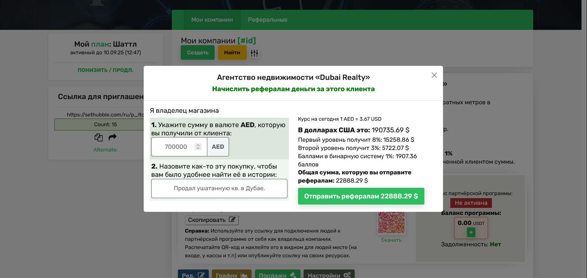 Рабочий пример начисления денег и баллов в бинарную систему. Все параметры — от процентов до глубины — владельцы бизнеса настраивают сами.